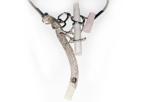 Der Anhänger ist meine Arbeit zum Thema Aufbruch. Es handelt sich um ein silbernes Collier mit Bohrkernen aus Rosenquarz und Marmor.