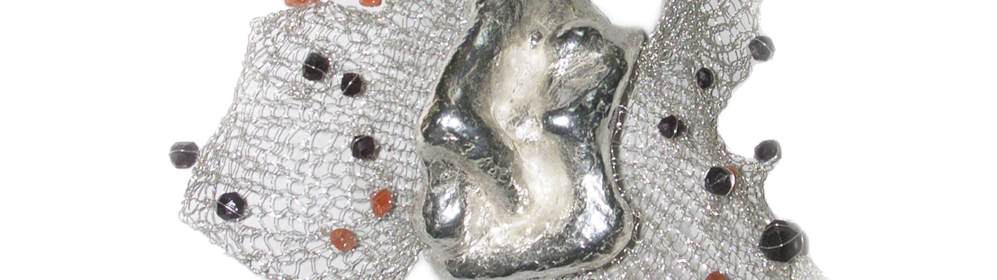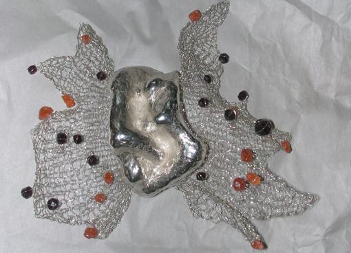 Der Armreif ist massiv aus Silber und stellt – ganz abstrakt – zwei aneinander liegende Körper dar. An den Seiten habe ich in regelmässigen Abständen winzige Löcher gebohrt und mit ø 0,25 mm dünnem Silberdraht begonnen, zwei Flügel an den Reif zu stricken. In diese gestrickten Manschetten habe ich Granat-Kristalle eingearbeitet.