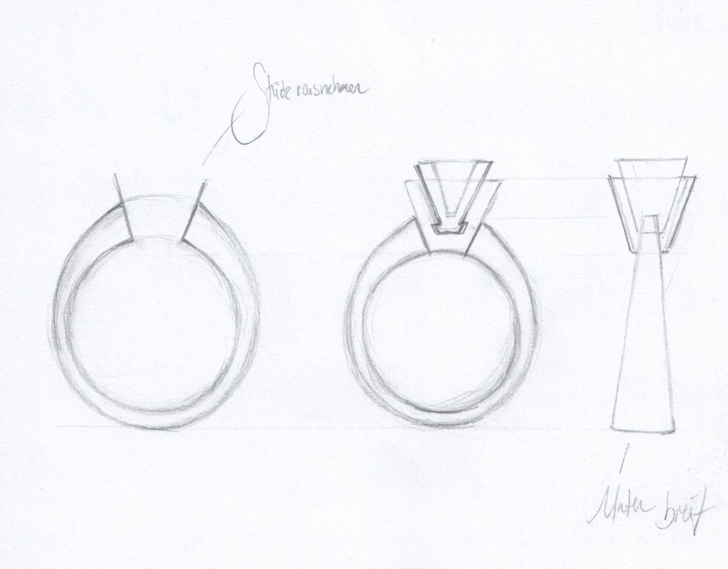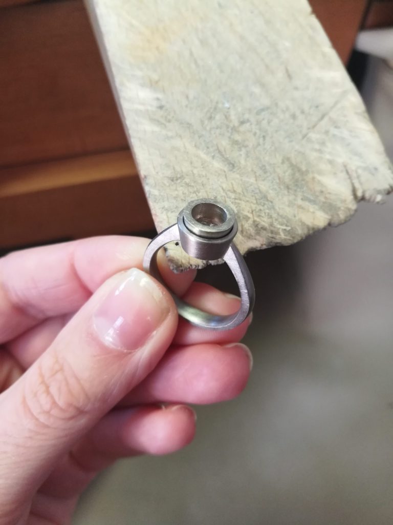 Als besonderes Element sollte auf den fertigen Zugenschienenring ein Edelstein in einer Fassung mit Schattenfuge gefasst werden, den die Kundin mitgebracht hatte.